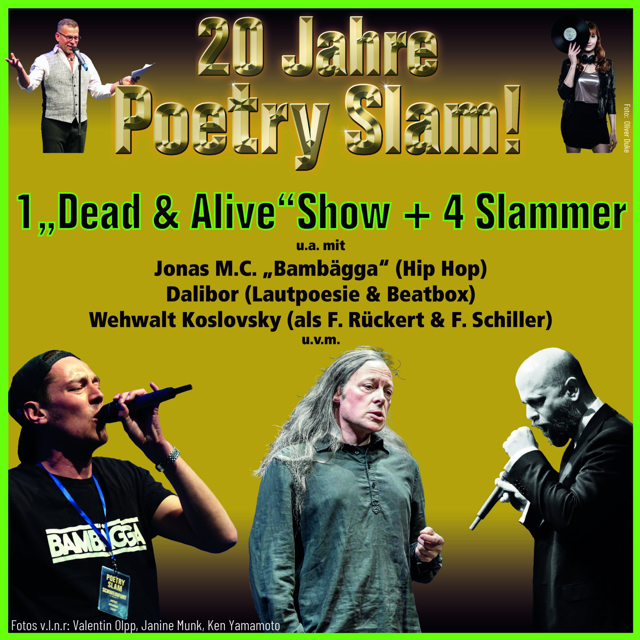 Dabei auch Jonas MC „Bambägga“ (BA) dessen Rhythmus schon einmal beim Highlander den Saal erbeben lies. Als Wortakrobat sind seine pointierten Texte, unverkennbare Stimme und charismatische Bühnenpräsenz schon als Vorgruppe zu „Fanta 4“ gefragt gewesen. Wehwalt Koslovsky (FFM) hingegen, wird als „Dead“ erscheinen und in die Rollen von Friedrich Rückert und Friedrich Schiller schlüpfen. „Soschka“ aus Leipzig wird mit einer Liveperformance am Abend überraschen. In die Show eingebettet ein Poetry Slam (s. Line Up). Darunter Sadaf Zahedi (Bremen), die den Verein „Bildung ohne Bücher“ ins Leben rief. Das Projekt bringt kostenlos Kindern mit besprochenen MP3-Playern Bildung. Zu Orten, wo es bisher unmöglich schien (z.B. Afghanistan).